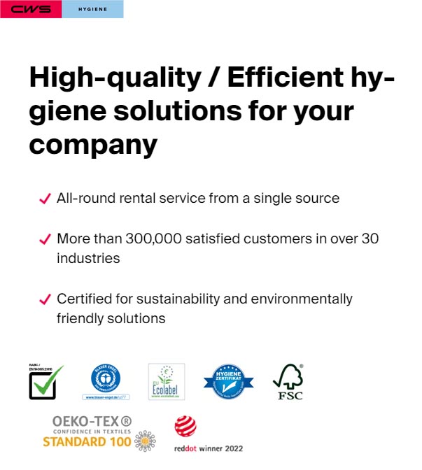 สินค้า ด้านสุขอนามัยภัณฑ์ ของเราภายใต้ CWS Group ประเทศเยอรมันนี ผู้นำอันดับ 1 ของโลกด้าน สุขอนามัยภัณฑ์ บริการด้วยนวัตกรรมและเทคโนโลยี เพื่อมอบบริการและสร้างมาตรฐานสูงสุดด้านสุขอนามัยที่ดีให้แก่ลูกค้า เรามีทีมสนับสนุนจากต่างประเทศพร้อมทีมงานในประเทศไทย ที่เป็นมืออาชีพคอยดูแลลูกค้าอยู่เสมอ